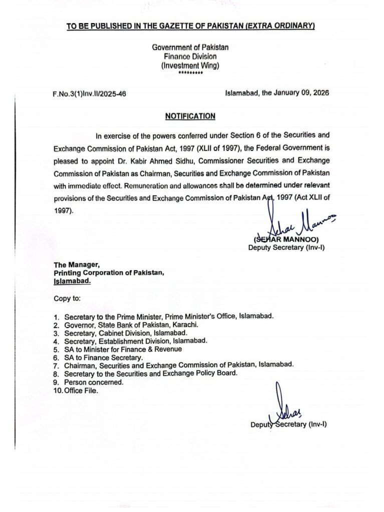 ISLAMABAD:  Prime Minister Shehbaz Sharif has appointed Dr. Kabir Ahmed Sidhu as the new Chairman of the Securities and Exchange Commission of Pakistan (SECP). An official notification to this effect has been issued.