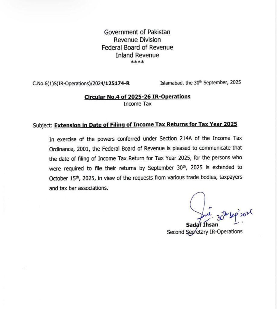 The Federal Board of Revenue (FBR) has officially extended the deadline for filing income tax returns for the Tax Year 2025 to October 15, 2025. The decision was made under Section 214A of the Income Tax Ordinance, 2001, following multiple appeals from trade bodies, tax bar associations, and members of the public.