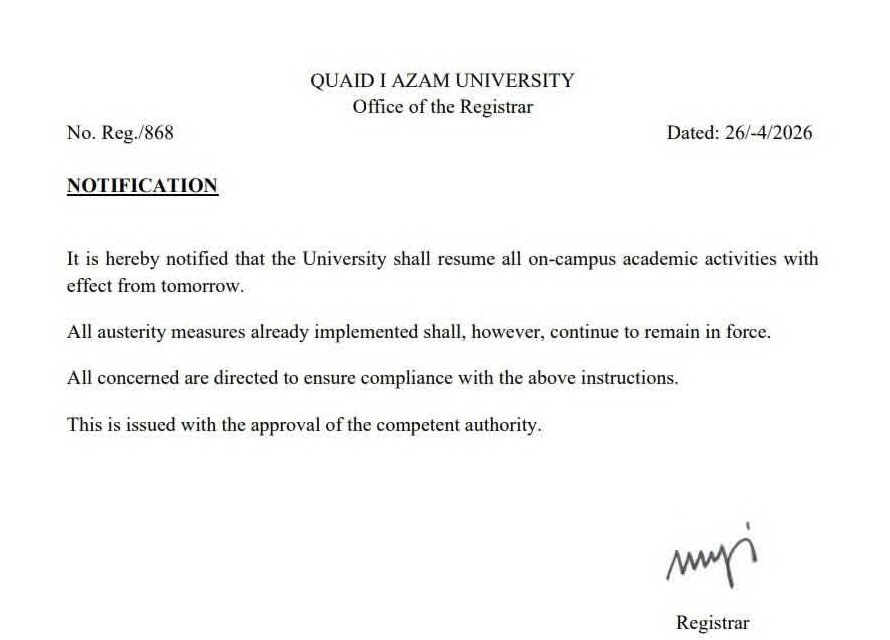 International Islamic University Islamabad confirmed that all classes will resume physically from Monday. The university also postponed mid-term examinations scheduled for April 20–21, with revised dates expected to be announced soon. During the disruption, the administration had introduced a four-day work week and partial work-from-home arrangements for staff.