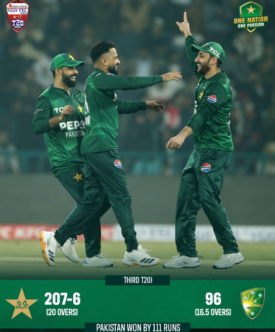 LAHORE: Pakistan delivered a commanding performance to crush Australia by 111 runs in the third and final T20I at Gaddafi Stadium, sealing a comprehensive 3-0 series sweep against the visitors.