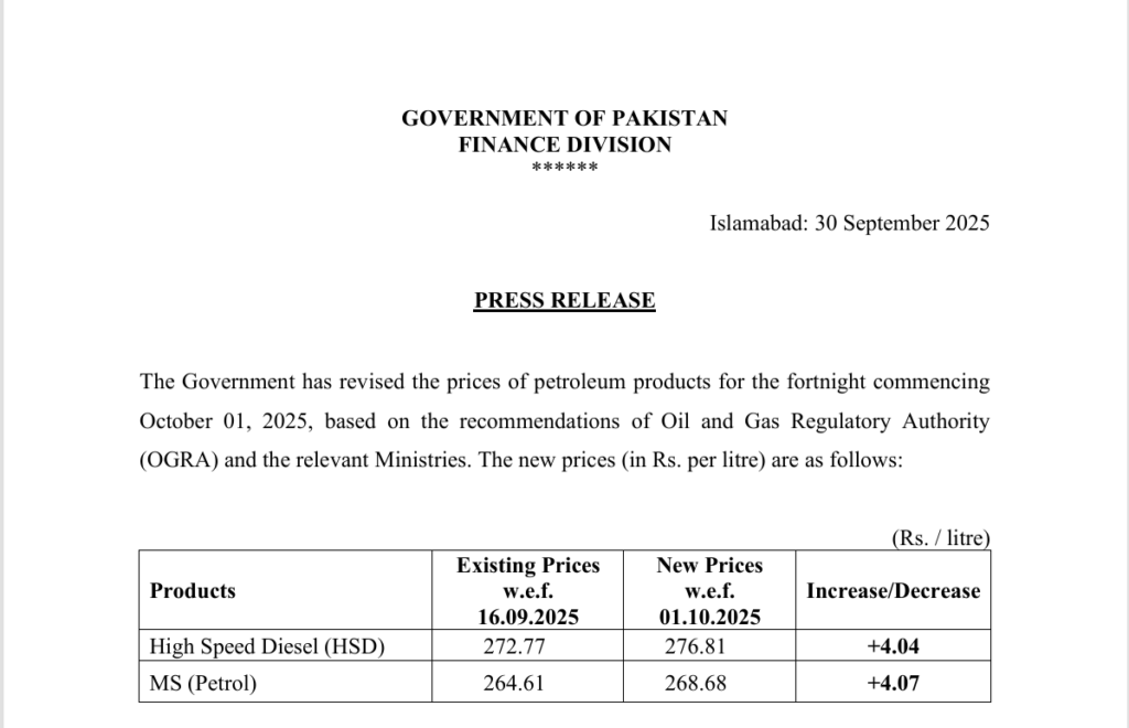 According to the official press release issued by the Finance Division on September 30, the price of High Speed Diesel (HSD) has risen from Rs272.77 to Rs276.81 per litre, marking an increase of Rs 4.04. Similarly, the price of MS (petrol) has been revised upward from Rs264.61 to Rs268.68 per litre, reflecting a hike of Rs4.07 per litre.