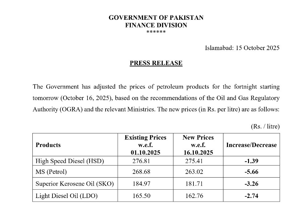 ISLAMABAD: The federal government has announced a reduction in the prices of major petroleum products for the next fortnight, effective from October 16, 2025. The decision was made on the recommendation of the Oil and Gas Regulatory Authority (OGRA) and relevant ministries in light of global price trends and currency adjustments.