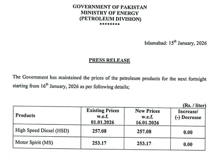 ISLAMABAD: It was a chilly morning in Islamabad when, on January 15, 2026, the Ministry of Energy (Petroleum Division) issued a press release. The announcement stated that for the next fortnight starting January 16, the prices of petrol and high-speed diesel would remain exactly the same as they had been since January 1: Motor Spirit (petrol) at Rs 253.17 per litre and High Speed Diesel at Rs 257.08 per litre. No increase, no decrease—just the same old figures.