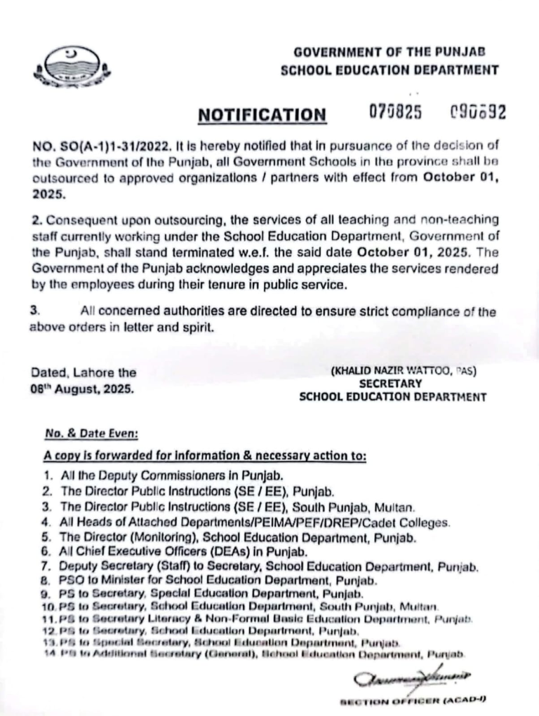 According to an official notification issued by the School Education Department, the restructuring will transfer management of public schools to approved external organizations. The order, signed by Secretary of the School Education Department Khalid Nazir Wattoo, confirms that the services of all teaching and non-teaching employees will formally end on October 1, 2025. The notification noted that the provincial government “acknowledges and appreciates” their contributions to public service, but made clear that the shift in management is part of a comprehensive restructuring plan.