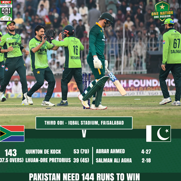 FAISALABAD: South Africa collapsed for 143 runs in 37.5 overs against Pakistan in the third One Day International at Faisalabad on Saturday, November 8, 2025. Pakistan’s bowlers dominated the innings after South Africa opted to bat first in the day-night encounter of the ongoing South Africa tour of Pakistan.